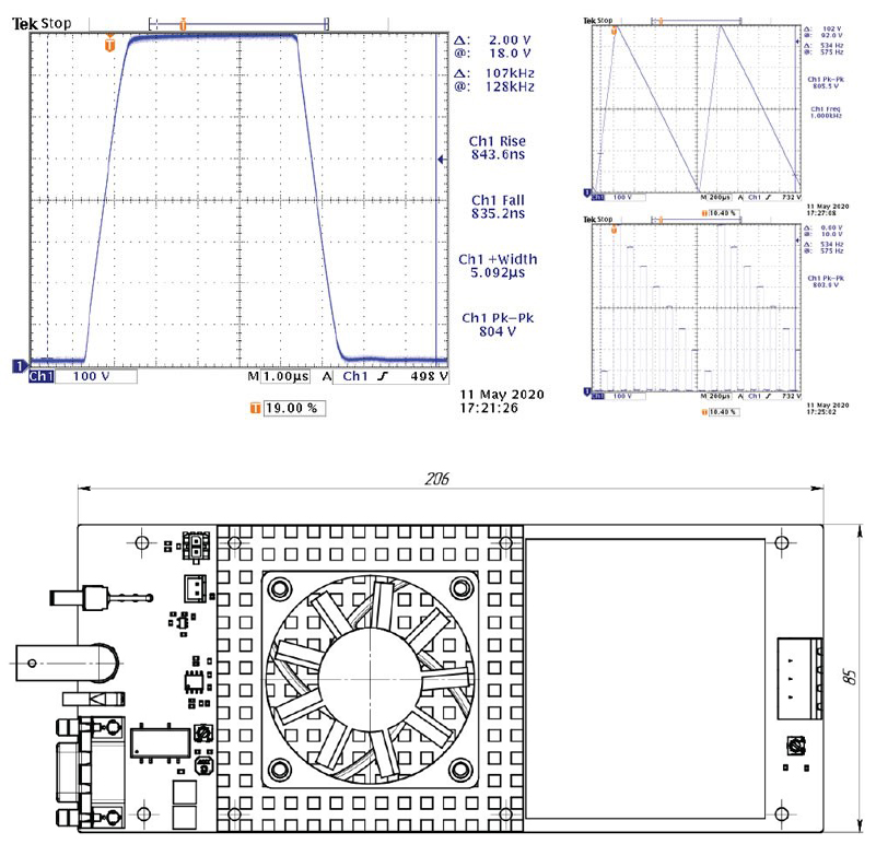 根据负载电容和驱动器的不同配置,转换时间最快可达5-7ns。脉冲宽度< 15ns(固定),100-2000ns(客户选调)。电源需要配备高压和低压电源,高压直流输入应为双极。低压电源为24VDC,电流小于2A,模块水冷。可根据客户要求提供不同配置的进水口。接口类型为模拟和RS-485,同时可提供用于Windows?7系统的软件。
