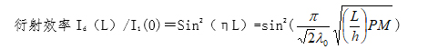 式中,P为超声功率,M为声光品质因素,M=n6p2/ρVS3. n,p,ρ分别表示材料的折射率,光弹性系数和密度。L/h为换能器长宽比,λ0为真空波长。如果衍射光Id 占的百分比足够大,则可能使光腔的总损耗大于小讯号增益,此时,振荡停止,激活介质(YAG棒)借助光泵浦积累粒子数的反转。在某一个时刻,如果去掉超声行波,则由于激活介质有很高的储能,所以,产生强的振荡脉冲――即声光调Q脉冲。如果用一定频率的脉冲调制器调制射频发生器,使声光介质中有相同重复频率的射频超声场时,就能获得重复频率工作的声光Q开关,激光器将以重复频率状态输出激光巨脉冲。