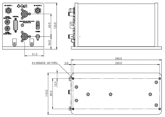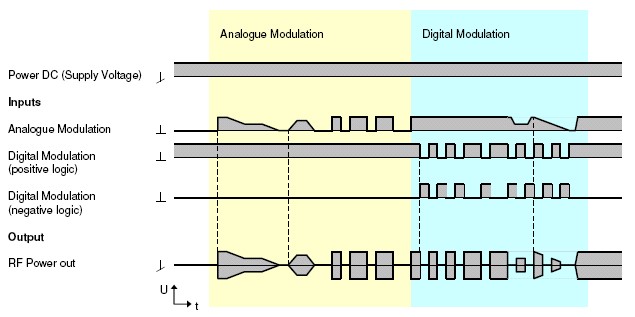 最大射频输出功率可通过内部电位器调节。模拟调制电压控制最大可调范围从0%到100%的输出功率。除模拟调制电压外,数字调制控制信号还可以打开和关闭射频电源。下面的操作方案详细说明了两个调制信号的相互作用。模拟和数字调制的特点是最小的开关电流比为65 dB。电源可以在调制频率(模拟和数字)高达25%的载波频率和最大50MHz下运行。通过铝壳来实现最佳的电磁屏蔽和机械保护,底板用于安装和散热。