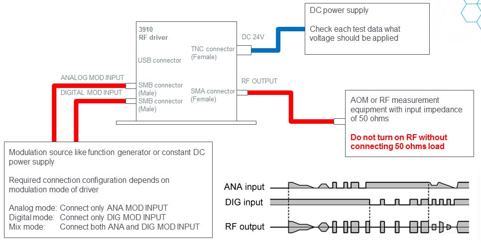 调制模式决定了所应用的射频功率如何变化,从而决定了衍射光的强度。在数字调制中,射频功率通过TTL信来控制开/关状态,从而控制光束是否衍射。在模拟调制中,通过在指定范围内施加电压来控制射频功率,从而产生对衍射效率的控制,并及时形成波形。