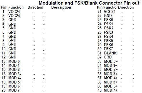 Pin1 RF ON状态(out);Pin2 SWR故障指示(out);Pin3电源温度故障指示(out);Pin4复位SWR故障/初始化(in);Pin5联锁2故障指示(out);Pin6联锁2(in);Pin7联锁1(in);Pin8联锁1故障指示(out);Pin9电源温度监控(out);Pin10调制接地(MGND);Pin11模拟调制2(参考MGND);Pin12模拟调制1(参考MGND);Pin13功率电平选择(参考MGND);低→选择模拟模式。1、 高→选择模拟模式。2、 Pin14…22底盘接地(CGND);Pin23…24调制接地(MGND);插脚25未连接