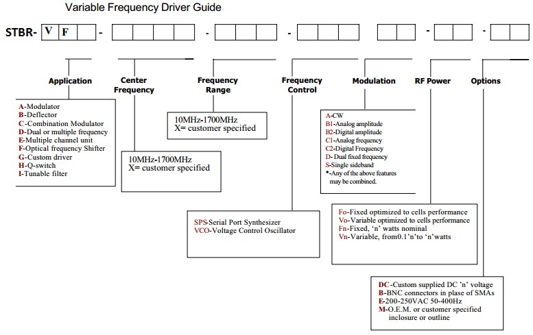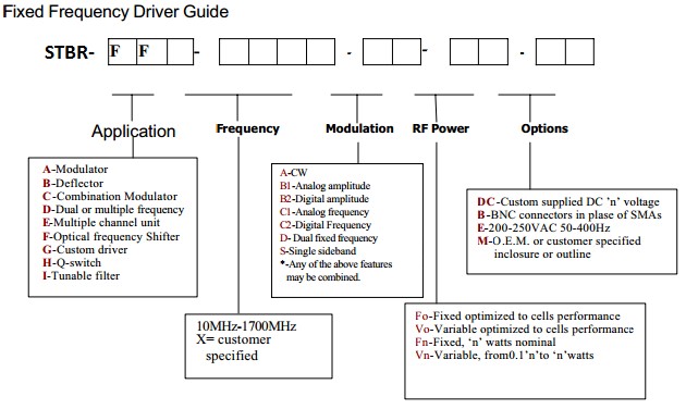 产品型号 | 可兼容的声光器 | 运行频率MHz | 最大射频功率 | 主要特点 |