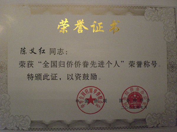 祝贺陈义红当选全国归侨侨眷先进个人