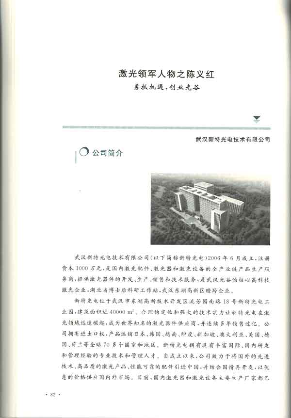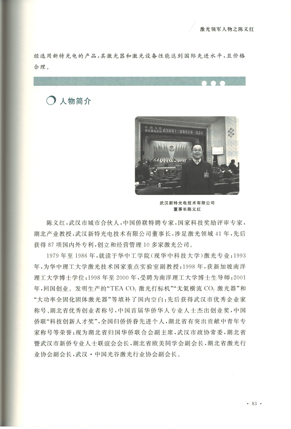 《激光领军人物》由湖北省激光行业协会编写,由华中科技大学出版社2020年7月出版发行,讲述了中国五十一位激光企业家的创业故事,是我国改革开放以来科技事业蓬勃发展的历史缩影。
