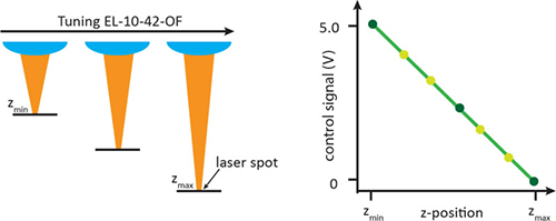 下图左边显示如何通过调节STOT-EL-10-42-OF镜头以改变聚焦光斑的Z轴位置,右边显示的是控制信号与Z轴位置的关系。
