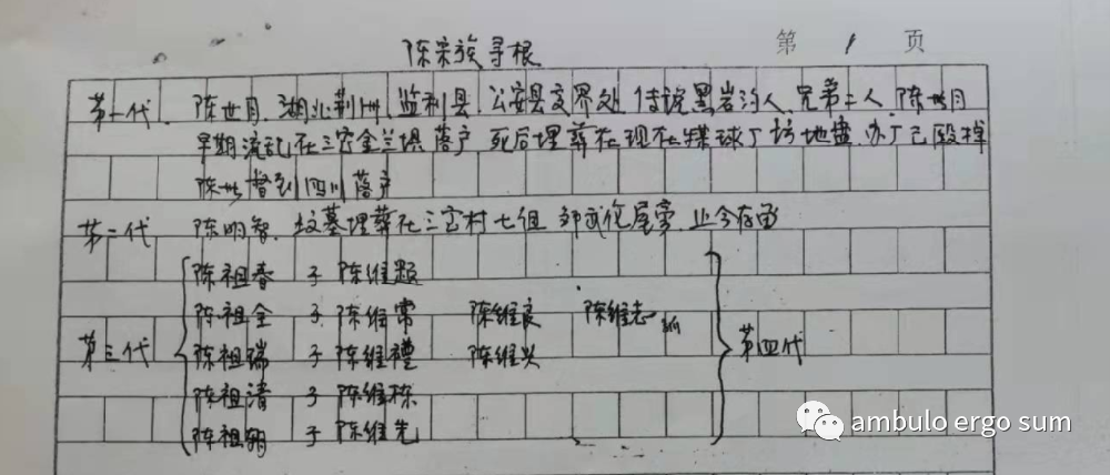 1陈世月——2陈明智——3陈祖春——4陈维题(配刘氏,1788-1856)——5陈永祥(配康氏)——6陈德才(1843-1912,配洪氏)——7陈昌立(配黄氏)
