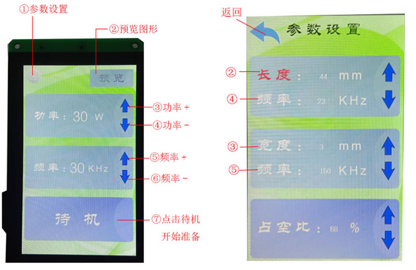 软件:软件可以设置激光功率、脉冲重复率、脉冲占空比,也可以分别设置X方向和Y方向的扫描长度和激光频率。