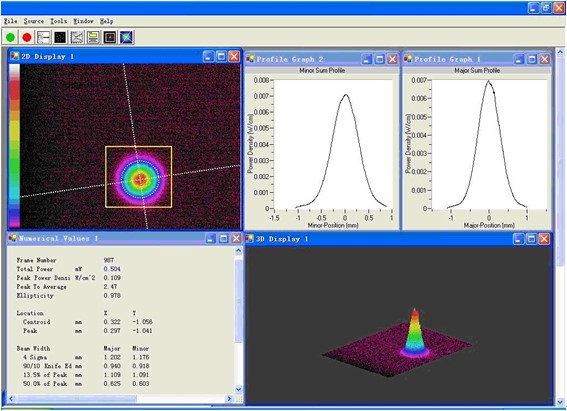 采用激光轮廓分析仪测试激光横模内的能量分布情况。软件界面上可显示能量的一维、二维和三维能量分布情况,以及光斑直径、发散角和椭圆度等激光横模轮廓特征。