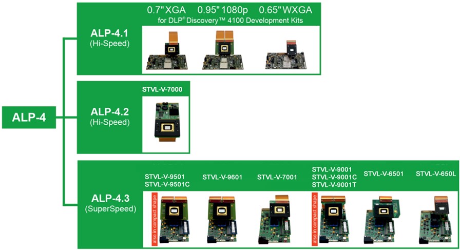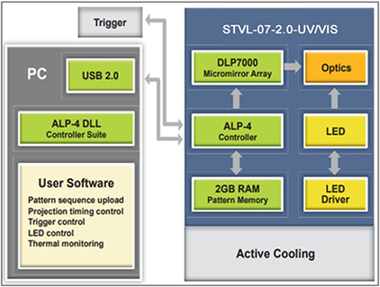 ALP-4控制器套件是一个通用平台,可实现DLP微镜的高级控制系统。为工业、医学、研究和开发而设计的一套广泛的库功能为应用程序开发提供了便利。我们推出了第一个ALP控制器套件TM,从2001年TI在市场上推出的第一个DLP Discovery芯片组开始。多年来,基于FPGA的DLP芯片组一直得到支持,保持了应用程序编程接口的完全兼容性。使用ALP-4的客户可以快速启动产品设计,而无需耗时开发软件、固件和高频FPGA逻辑代码。控制和数据流的方案如下面的框图(下图左)所示。操作原理与标准多媒体投影完全不同。图案序列在PC中生成,并通过压缩的USB传输上传到板载存储器。高度复杂的FPGA逻辑用于处理数据并将数据流传输到微镜阵列。ALP-4控制器套件包含在所有V模块中,如图(下图右)所示。它也可作为德州仪器DLP Discovery4100评估模块(EVM)的附件提供。