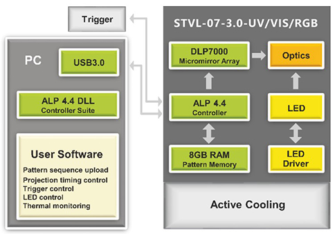 ALP-4.4控制器套件是中央编程工具,为产品开发提供所有必要的功能。图案序列通过无损压缩的USB3.0传输从PC上传到板载存储器。显示序列的属性,例如,比特深度、图片时间、触发模式、重复可以自由定义,以满足各自的应用要求。ALP-4.4固件将模式从板载SDRAM存储器流式传输到DLP7000微镜阵列,其中输入模式被一一映射到镜。模式在全局重置模式下更新;这意味着所有镜像在几微秒内同时切换。通过控制每个反射镜的开启时间来生成灰度值模式,从而产生精确的灰度值线性。最大全局阵列切换速率为22727帧/秒;甚至可以通过微镜阵列的部分更新来实现更高的帧速率。多个STVL-07-3.0-UV/VIS/RGB设备可以并行运行,方便地从同一应用程序进行控制,并通过触发设备精确同步。ALP-4.4 API已被证明适用于所有DLPC410芯片组;DLL支持C++、Python  LabVIEW、.NET等开发平台。Microsoft?操作系统支持最新的Windows?版本,包括32位和64位。ALP-4 USB3.0驱动程序功能强大,经过验证,符合UIF标准,并在工业和医疗应用中得到全天候验证。
